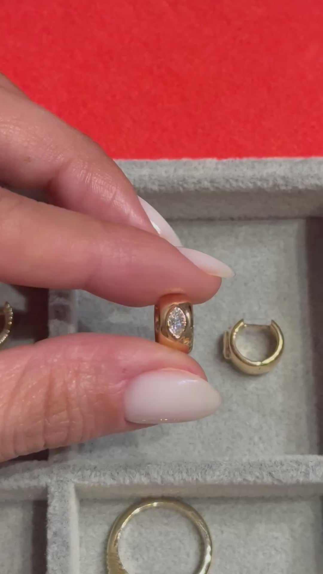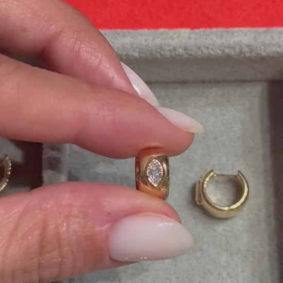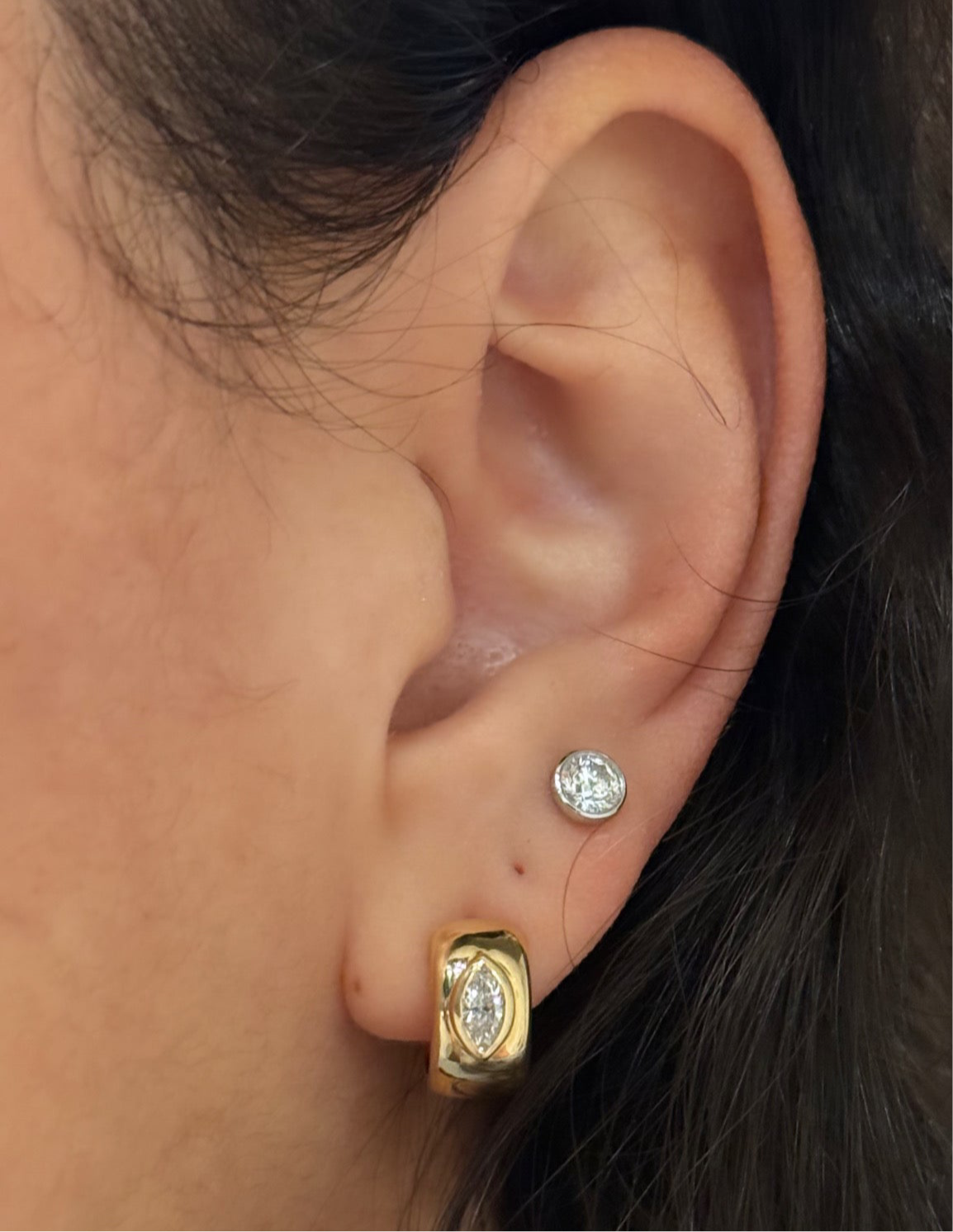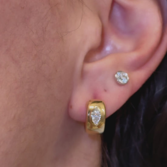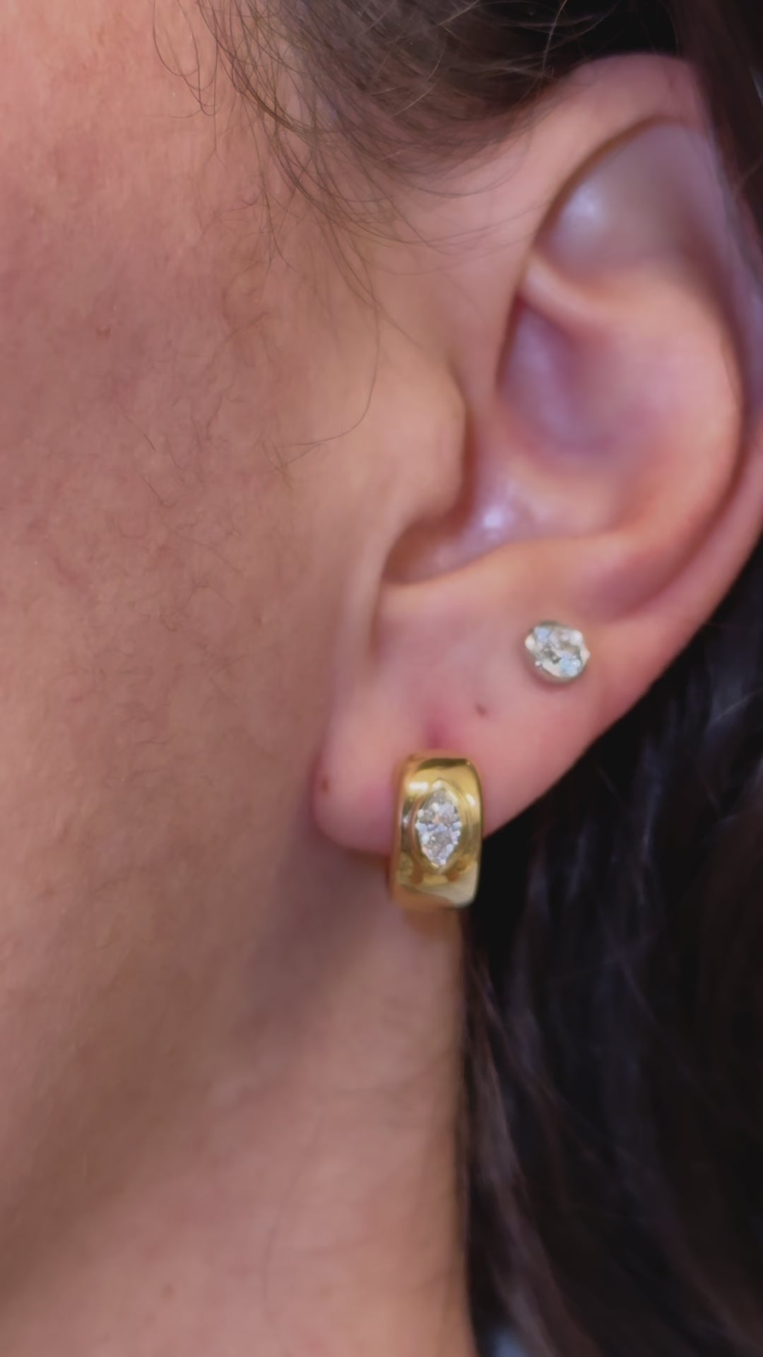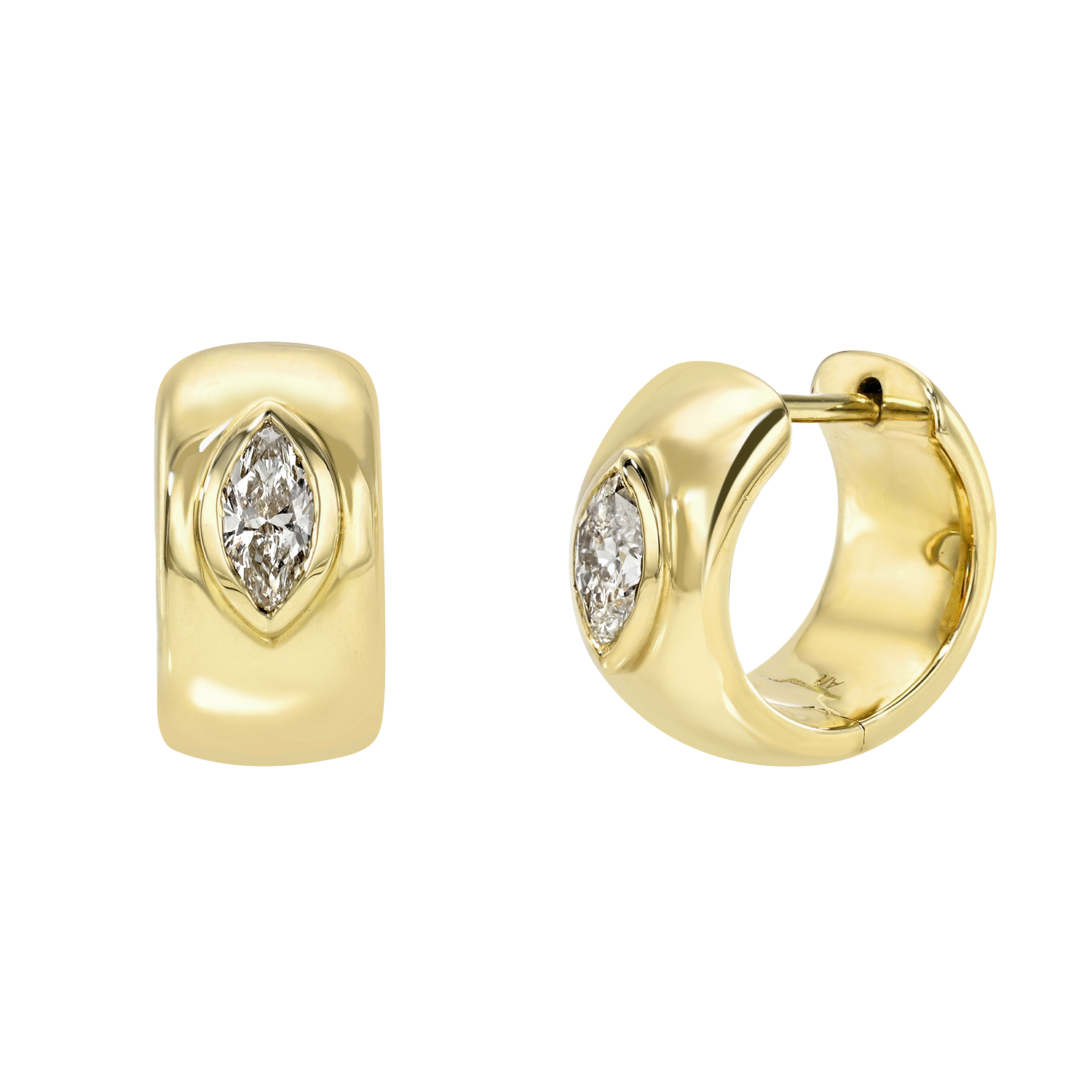 Gold huggie earrings feature a sleek, modern design with a bezel-set marquise-cut diamond at the center, adding a touch of sophistication and brilliance. Crafted for both comfort and style, they offer a secure hinged closure, making them perfect for everyday wear or special occasions.
