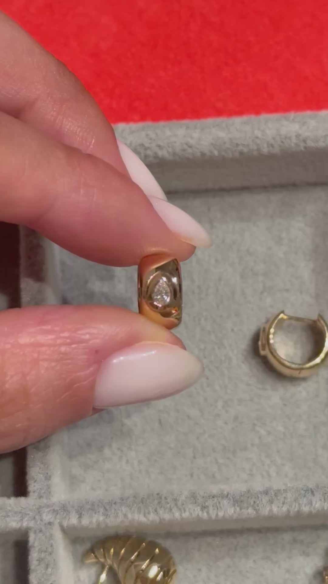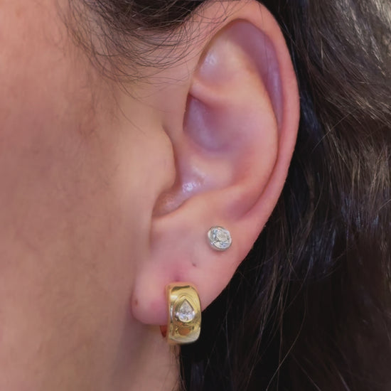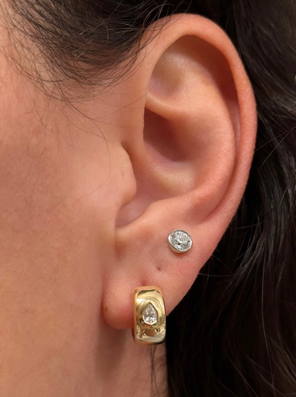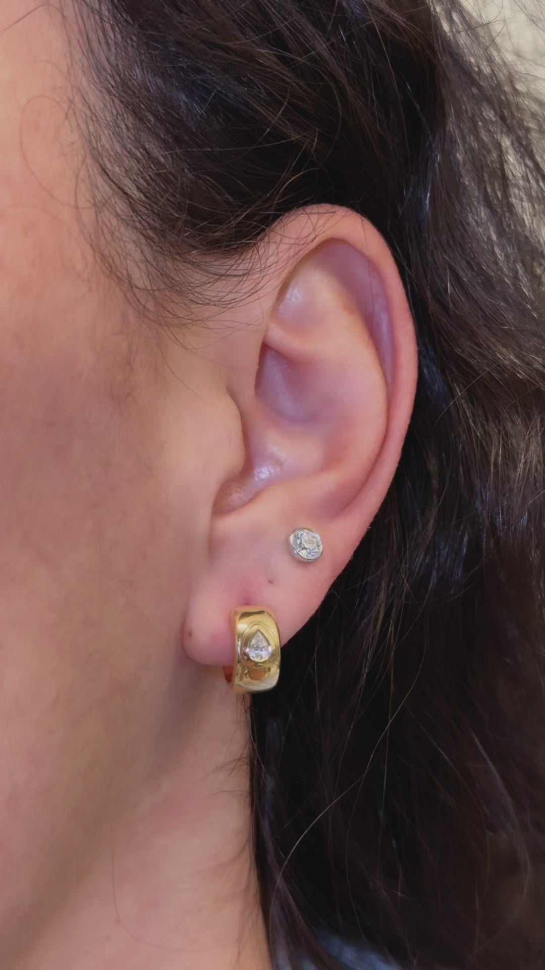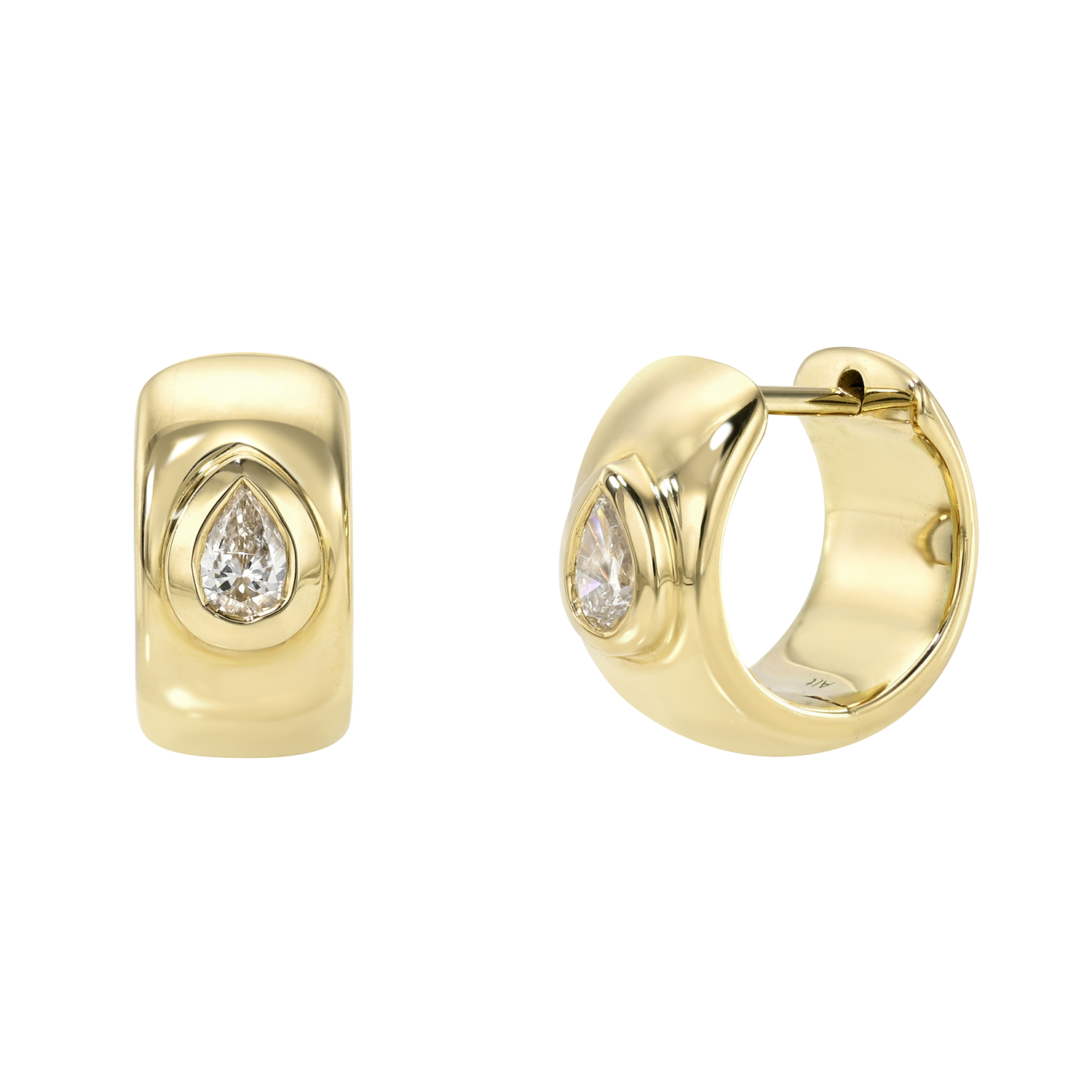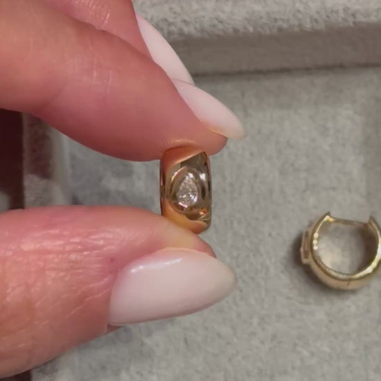 Gold huggie earrings feature a sleek, modern design with a bezel-set marquise-cut diamond at the center, adding a touch of sophistication and brilliance. Crafted for both comfort and style, they offer a secure hinged closure, making them perfect for everyday wear or special occasions.