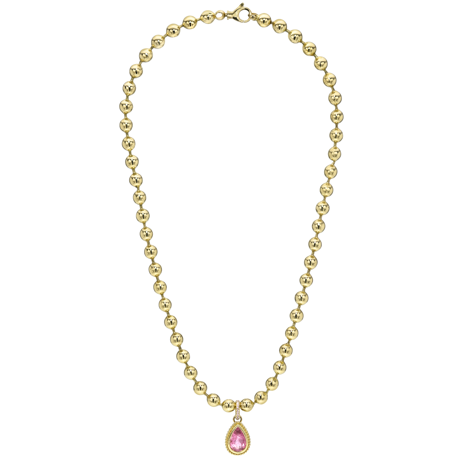 This ball chain necklace features polished gold beads throughout, creating a sleek and uniform look. At the center hangs a pear-shaped pink tourmaline pendant, bezel-set and elegantly accented with a delicate beaded halo around the stone. The vibrant pink of the tourmaline contrasts beautifully with the warm gold tones, making it a standout piece with both modern and classic appeal.