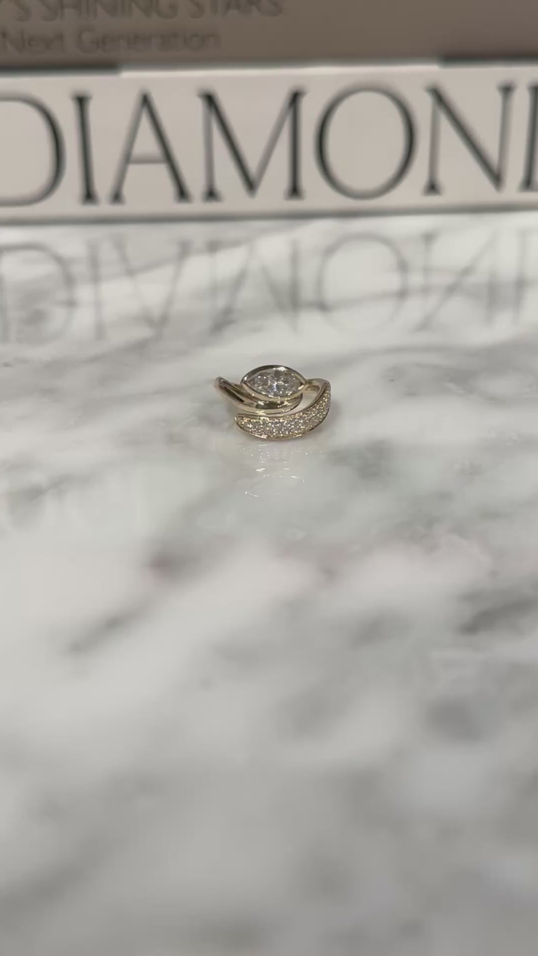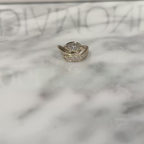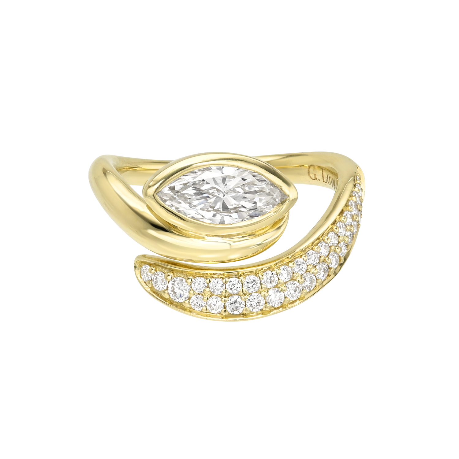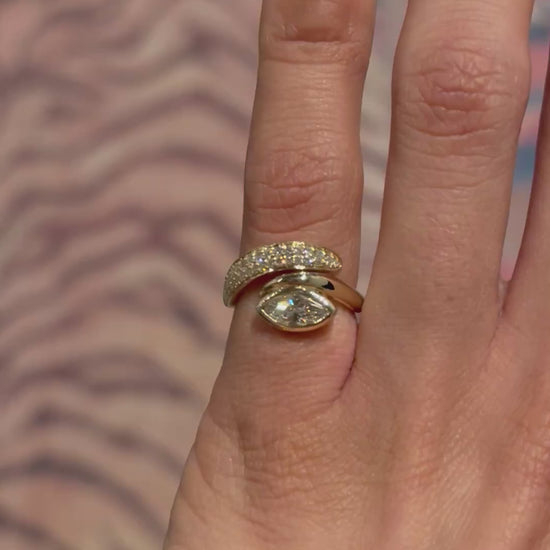 This is a striking 14k gold ring featuring a contemporary wrap-style design. The centerpiece is a prominent round-cut diamond, bezel-set for a sleek and secure look. It is flanked by two sweeping gold bands—one smooth and polished, the other encrusted with pavé-set diamonds—creating a dynamic, asymmetrical silhouette that elegantly hugs the central stone. Bold yet refined. Available in natural diamonds, send inquiry to info@gabby-love.com.